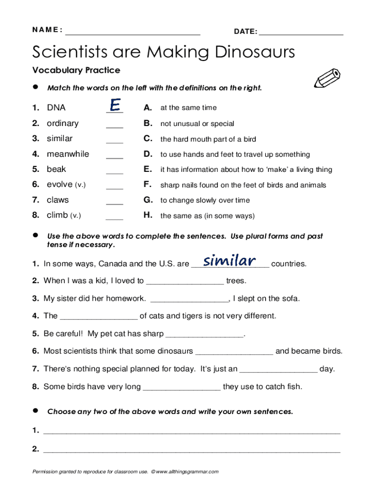 N A M E : DATE: Scientists are Making Dinosaurs Vocabulary PracticeMatch the words on the left with the definitions on the right.1. DNA. At the same time2. Ordinary. Not unusual or special3. Similar.