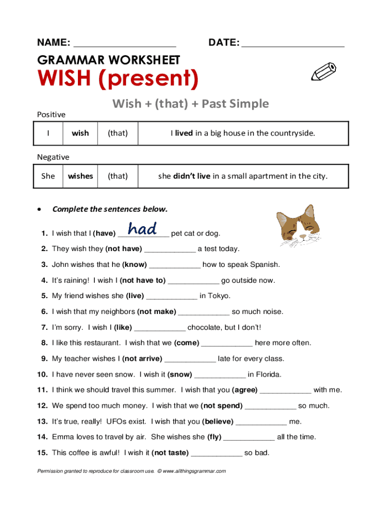 NAME: DATE: GRAMMAR WORKSHEETS (present) Wish + (that) + Past SimplePositive Irish(that)I lived in a big house in the countryside.wishes(that)she didn't live in a small apartment in the city. Negative