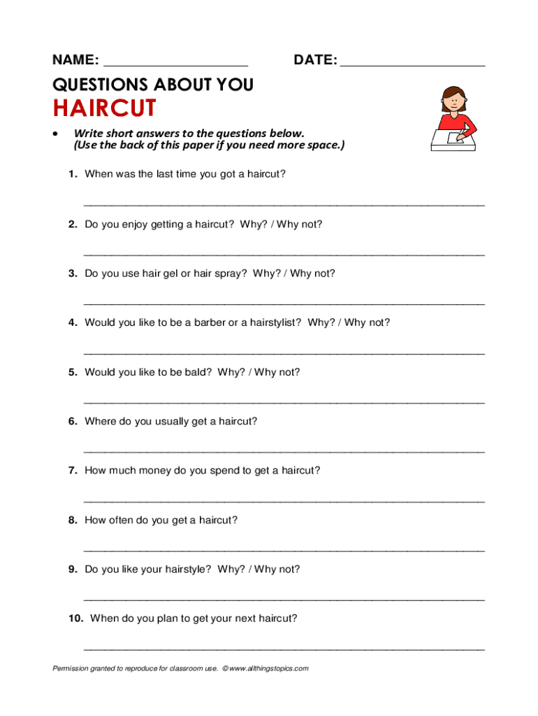 NAME: DATE: QUESTIONS ABOUT HAIRCUT Write short answers to the questions below. (Use the back of this paper if you need more space.) 1. When was the last time you got a haircut? 2. Do you enjoy getting