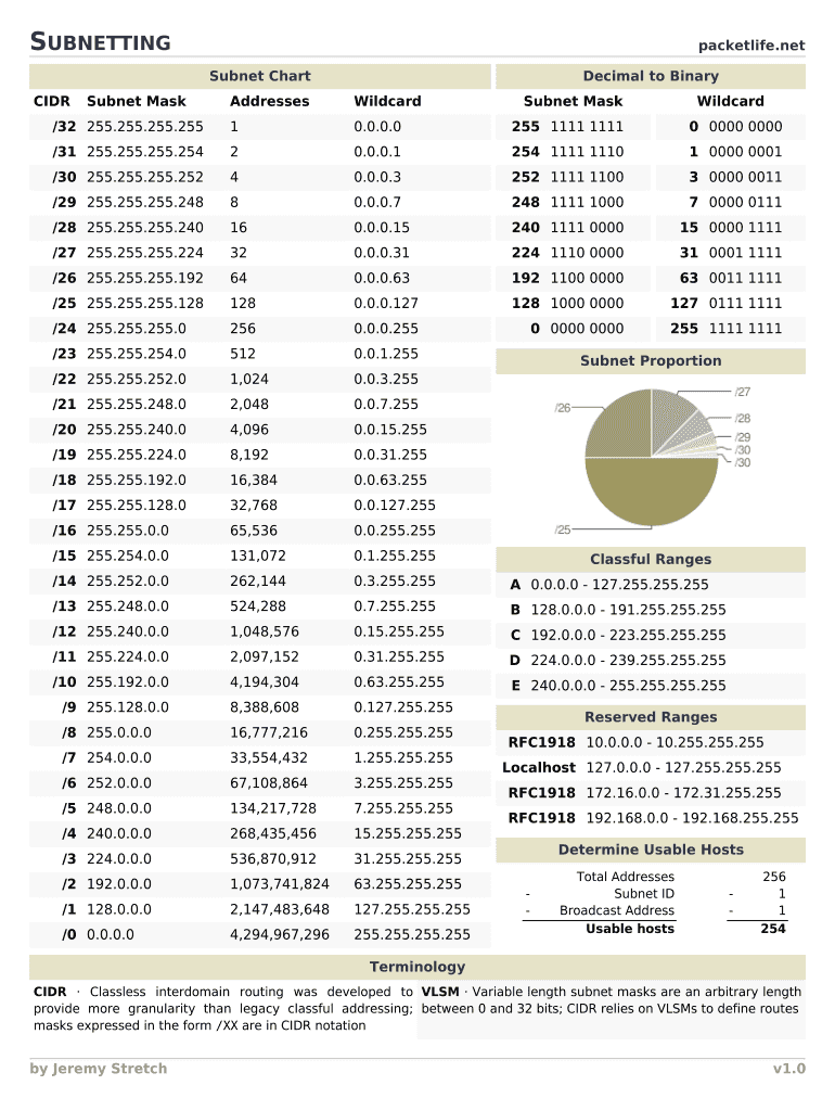 Subnet ChartCIDRSubnet MaskDecimal to BinaryAddressesWildcardSubnet MaskWildcard/32 255.255.255.25510.0.0.0255 1111 11110 0000 0000/31 255.255.255.25420.0.0.1254 1111 11101