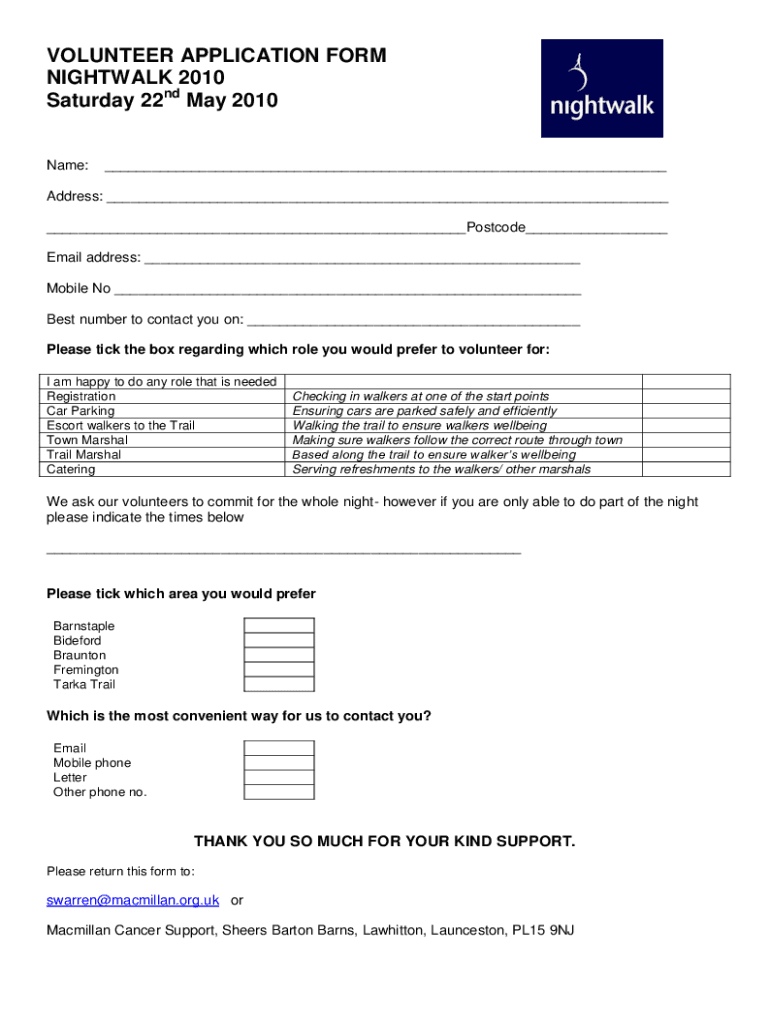 VOLUNTEER APPLICATION FORM NIGHTFALL 2010 Saturday 22nd May 2010Name: Address: Postcode Email address: Mobile No Best number to contact you on: Please tick the box regarding which role you would prefer