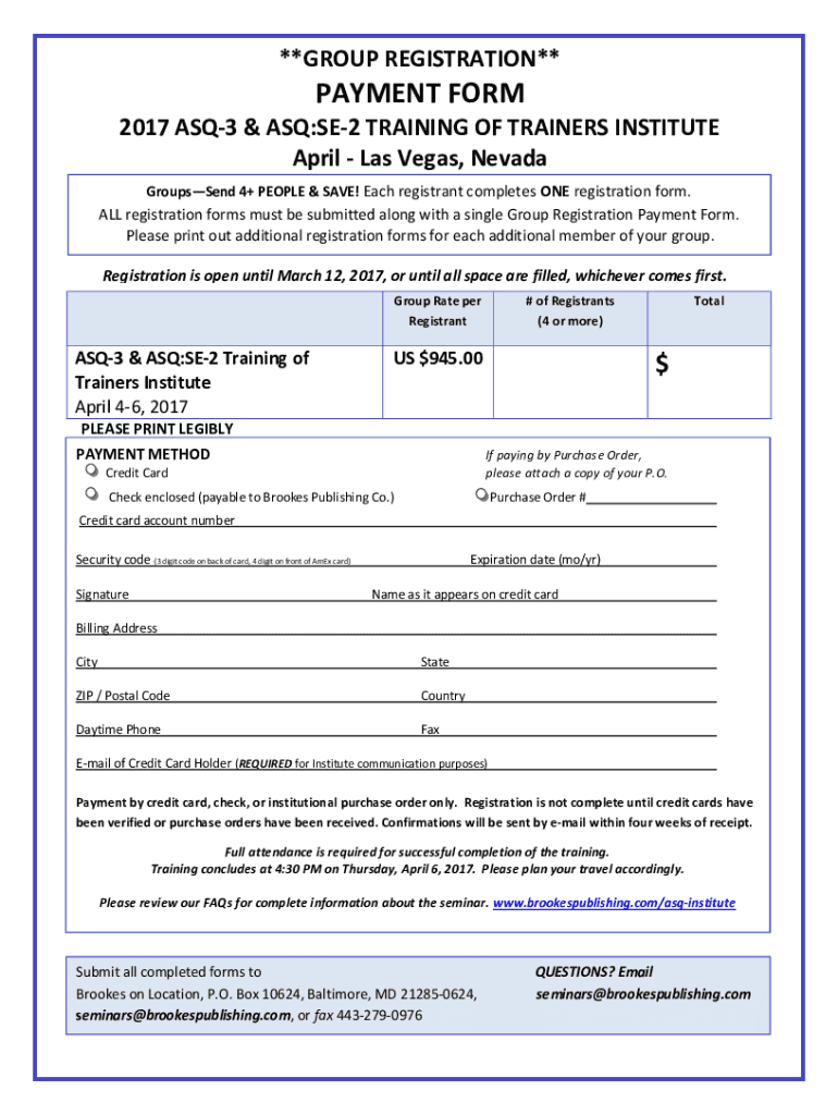 **GROUPREGISTRATION**PAYMENTFORM 2017ASQ3&ASQ:SE2TRAININGOFTRAINERSINSTITUTE AprilLasVegas, Nevada GroupsSend4+PEOPLE&SAVE! Each registrant completes ONE registration form. ALL registration forms