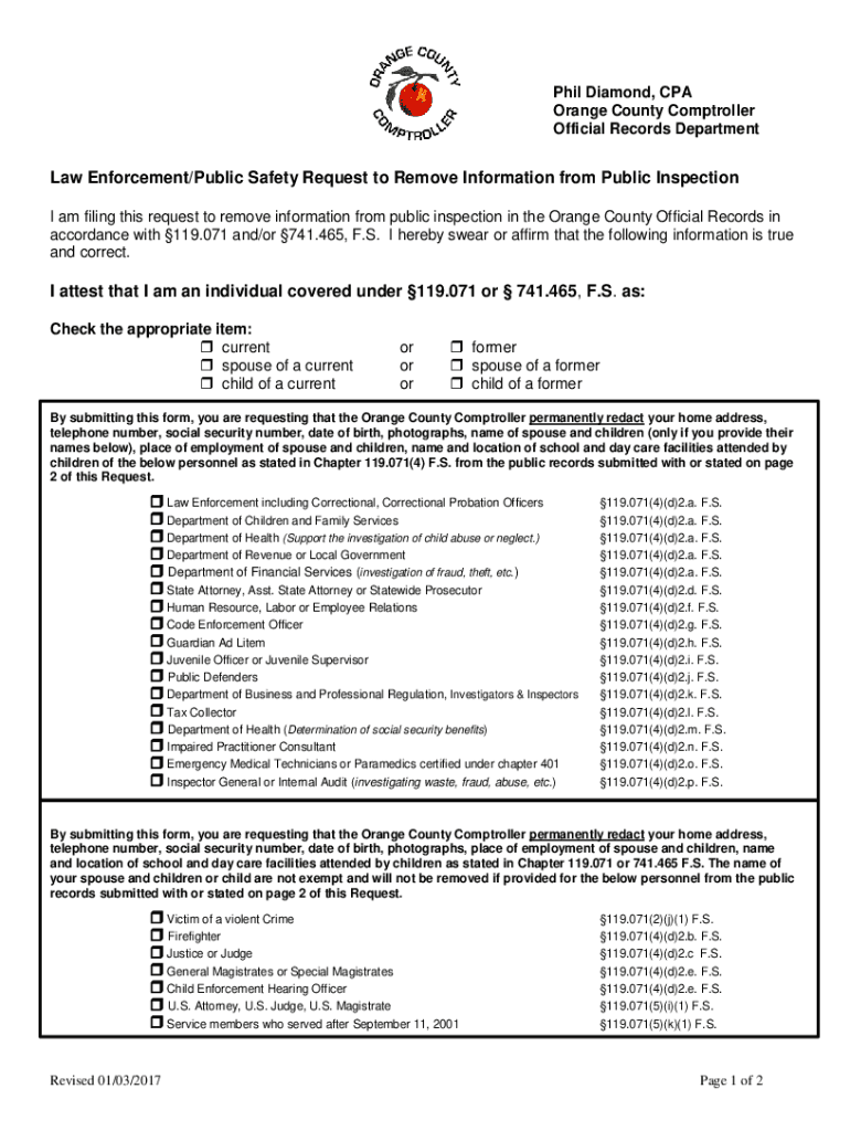Phil Diamond, CPA Orange County Comptroller Official Records Departmental Enforcement/Public Safety Request to Remove Information from Public Inspection I am filing this request to remove information