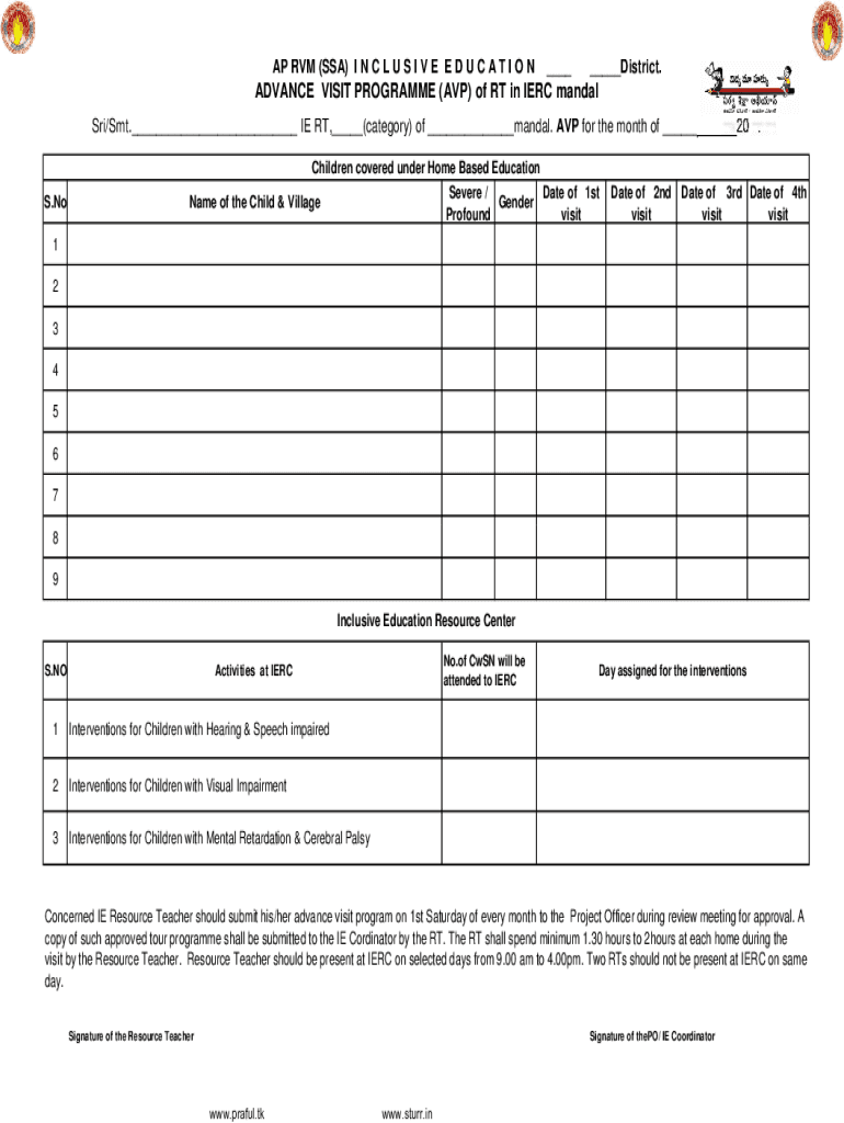 AP RVM (SSA) I N C L U S I V E E D U C A T I O N District. ADVANCE VISIT Program (AVP) of RT in IEC manual Sri/SMT. IE RT, (category) of manual. AVP for the month of 20. S. Children covered under