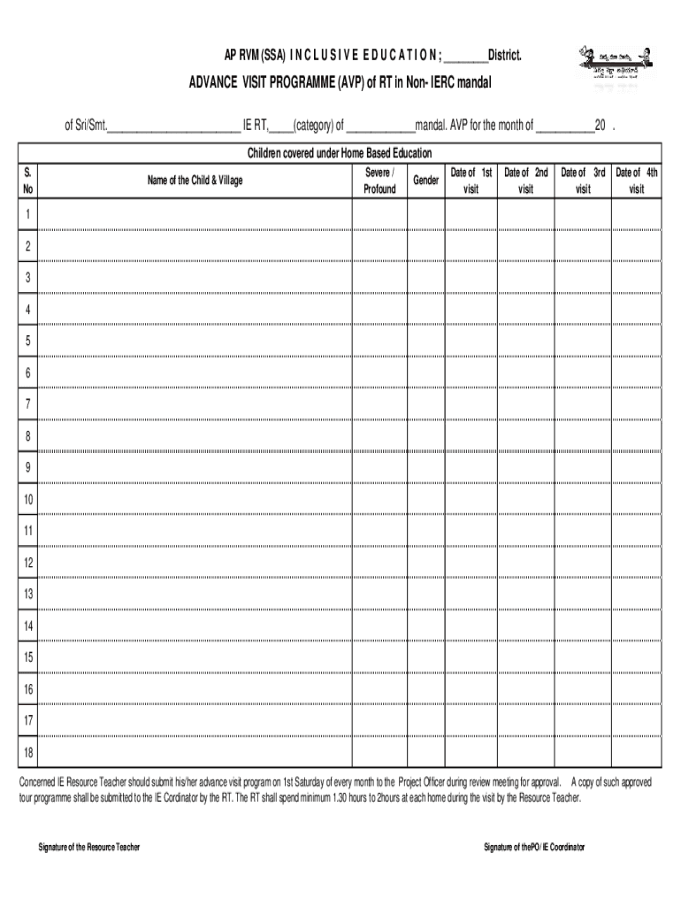 AP RVM (SSA) I N C L U S I V E E D U C A T I O N ; District. ADVANCE VISIT Program (AVP) of RT in Non IEC manual of Sri/SMT. IE RT, (category) of manual. AVP for the month of 20. Children covered