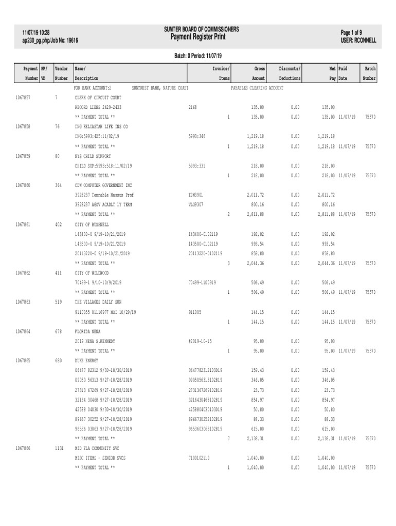 Batch: 0 Period: 11/07/19Payment HP/VendorName/Number VDNumberDescription
