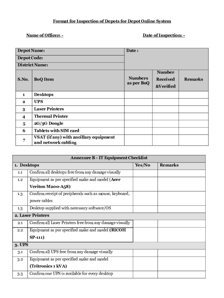 Format for Inspection of Depots for Depot Online System Name of Officer: Date of Inspection: Depot Name:Date :Depot Code: District Name: Number S. No. Numbers as per Bonbon Item1Desktops2UPS3Laser