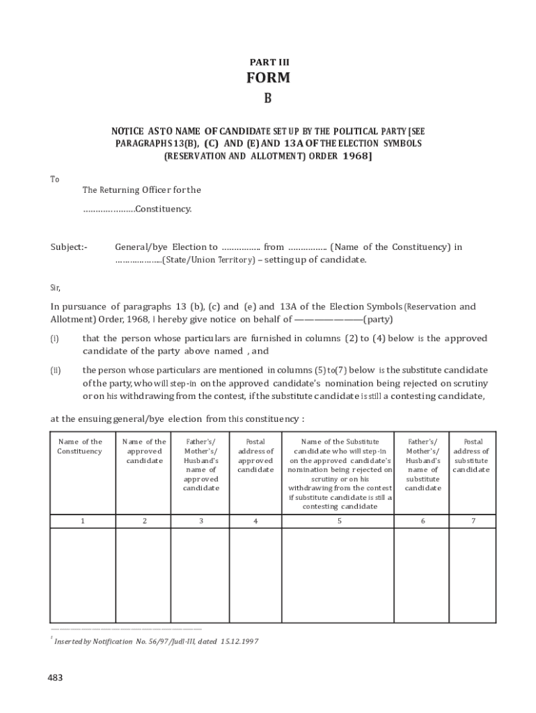 PART UNIFORM B NOTICE AS TO NAME OF CANDIDATE SET UP BY THE POLITICAL PARTY SEE PARAGRAPHS 13(B), (C) AND (E) AND 13A OF THE ELECTION SYMBOLS (RESERVATION AND ALLOTMENT) ORDER 1968 Tithe Returning