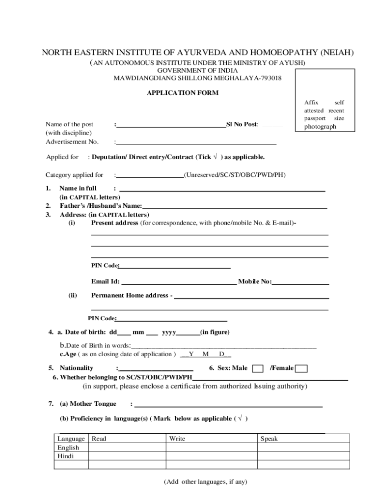 NORTH EASTERN INSTITUTE OF AYURVEDA AND Homeopathy (NEIGH) (AN AUTONOMOUS INSTITUTE UNDER THE MINISTRY OF AYUSH) GOVERNMENT OF INDIA MAWDIANGDIANG SHILLONG MEGHALAYA793018 APPLICATION FORM Affix self