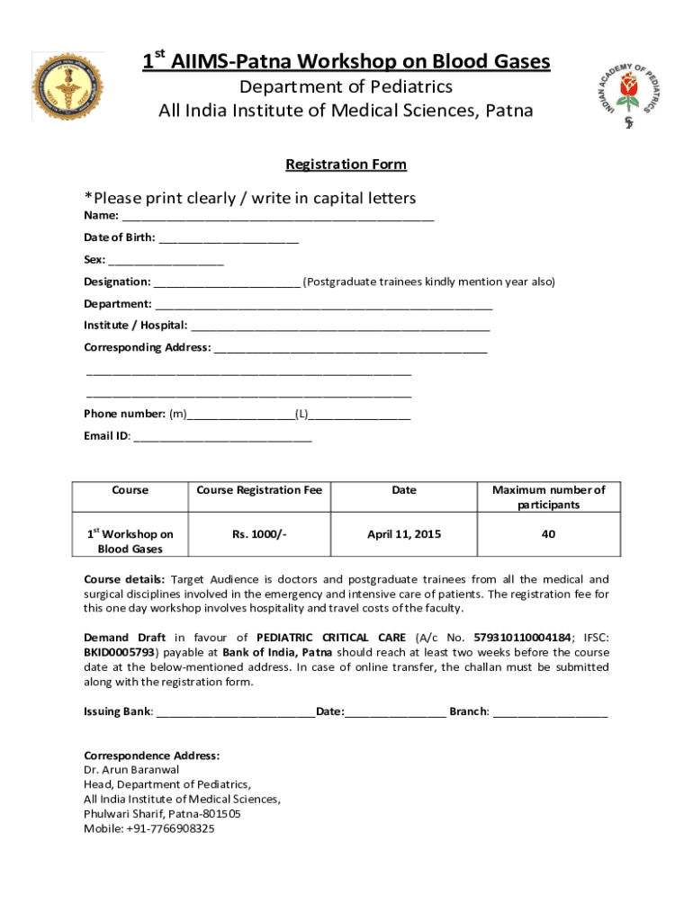 1st AIIMSPatna Workshop on Blood Gases Department of Pediatrics All India Institute of Medical Sciences, Patna Registration Form×Please print clearly / write in capital letters Name: Date of Birth: