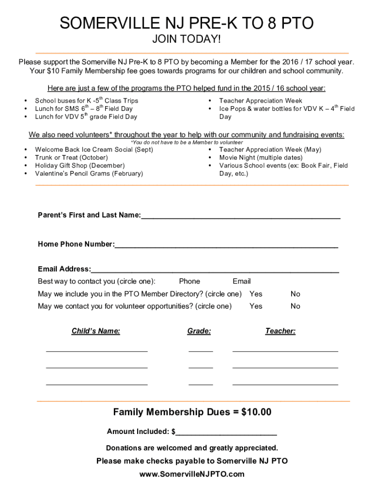 SOMERVILLE NJ PREY TO 8 PTO JOIN TODAY! Please support the Somerville NJ Prey to 8 PTO by becoming a Member for the 2016 / 17 school year. Your $10 Family Membership fee goes towards programs for