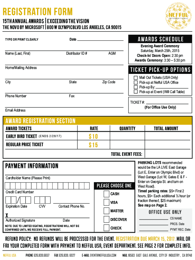 15TH ANNUAL AWARDS EXCEEDING THE VISION The Nova by Microsoft 800 w Olympic blvd Los Angeles, ca 90015 Datatype OR PRINT CLEARLYName (Last, First)Distributor ID #Evening Award Ceremony Saturday, March