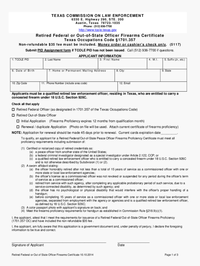 TEX AS COMMISSION ON L AW ENFORCEMENT 6330 E. Highway 290, STE. 200 Austin, Texas 787231035 Phone: (512) 9367700http://www.tcole.texas.govRetired Federal or OutofState Officer Firearms Certificate