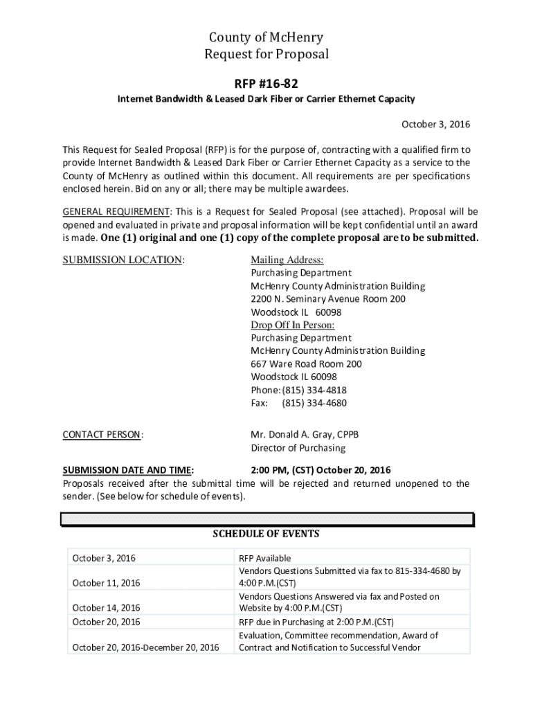 County of McHenry Request for Proposal RFP #1682 Internet Bandwidth & Leased Dark Fiber or Carrier Ethernet Capacity October 3, 2016, This Request for Sealed Proposal (RFP) is for the purpose of,