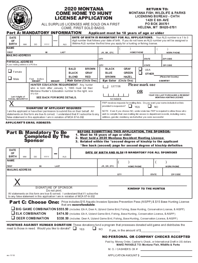 2020 MONTANA COME HOME TO HUNT LICENSE APPLICATIONRETURN TO: MONTANA FISH, WILDLIFE & PARKS LICENSING BUREAU CTH 1420 E 6th AVE PO BOX 200701 HELENA, MT 596200701ALL SURPLUS LICENSES ARE SOLD ON A