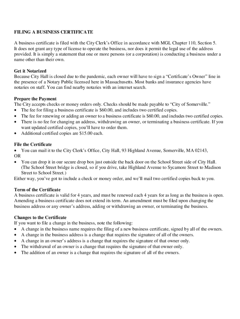 A business certificate is filed with the City Clerks Office in accordance with MEL Chapter 110, Section 5.