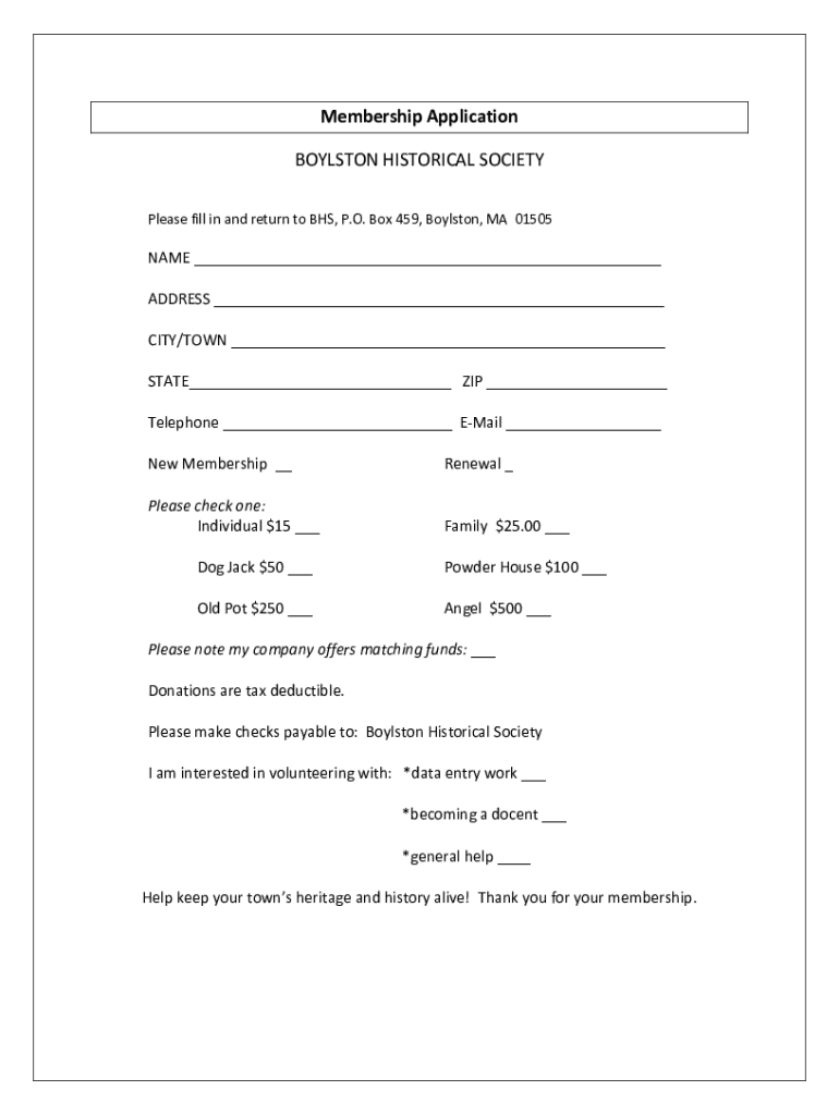 MembershipApplication BOYLSTONHISTORICALSOCIETY PleasefillinandreturntoBHS, P.O. Box459,Boston,MA01505 NAME ADDRESS CITY/TOWN STATE ZIP Telephone Email Membership Renewal Pleasecheckone: Individual$15