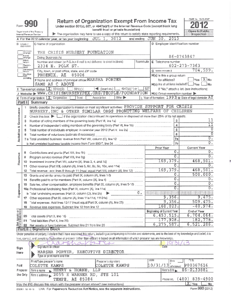 THE CRISIS NURSERY FOUNDATION Part III Statement of Program Service Accomplishments860743847Form 990 (2012)1Page 2Check if Schedule O contains a response to any question in this Part III Briefly describe