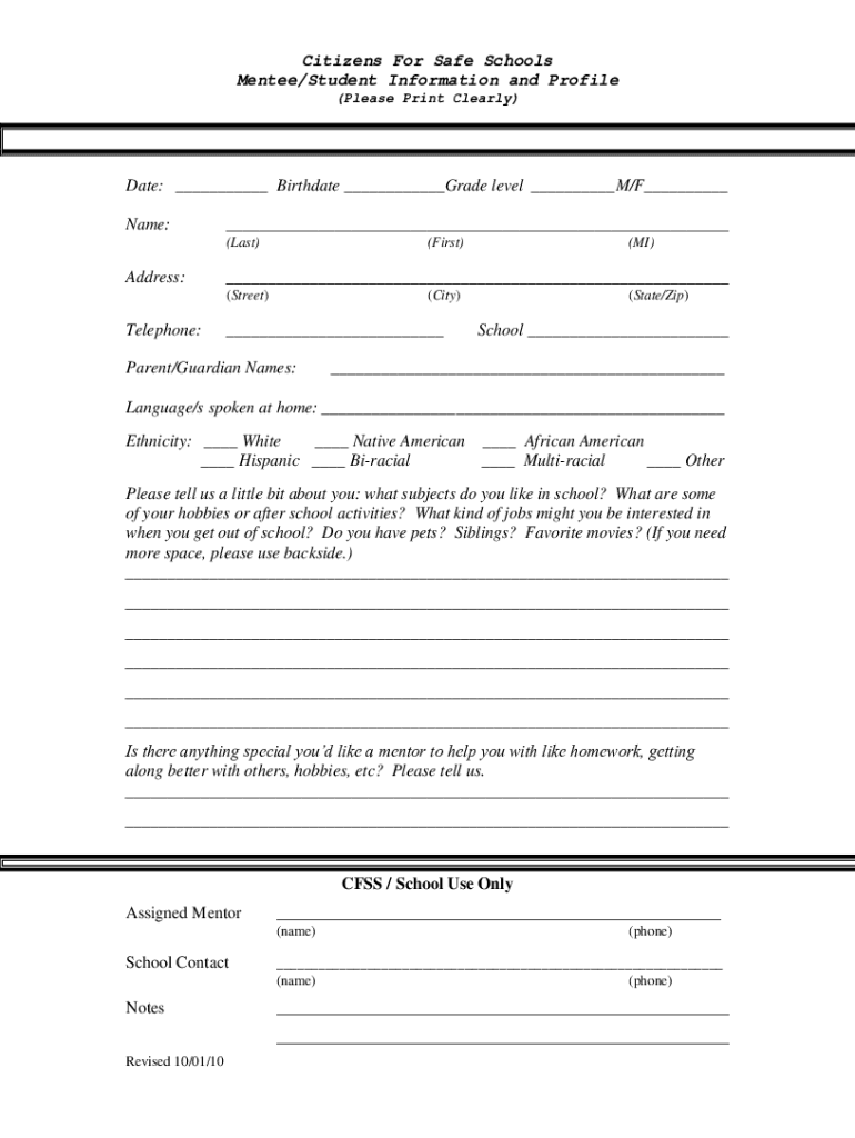 Citizens For Safe Schools Mentee/Student Information and Profile (Please Print Clearly)Date: Birthdate Grade level M/F Name: (Last)Address:(First) (Street)Telephone:(MI)(City) Parent/Guardian Names:(State/Zip)School