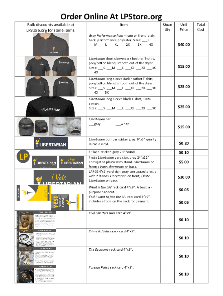 Order Online At Store.org Bulk discounts available at Store.org for some items. Item Gray Performance Polo logo on front, plain back, performance polyester. Sizes: S M L XL 2X 3X 4XQuan Titanic Price$40.00Libertarian