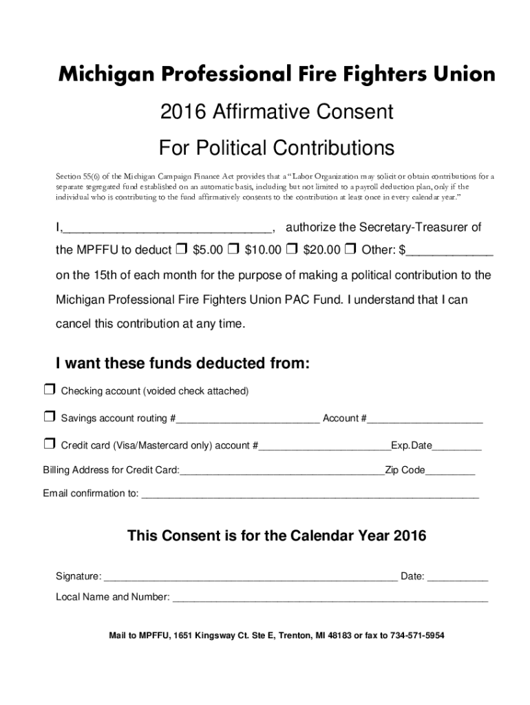 Michigan Professional firefighters Union 2016 Affirmative Consent For Political Contributions Section 55(6) of the Michigan Campaign Finance Act provides that a Labor Organization may solicit or obtain