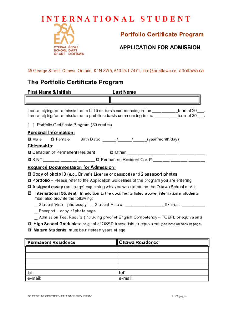 INTERNATIONAL STUDENT Portfolio Certificate Program APPLICATION FOR ADMISSION35 George Street, Ottawa, Ontario, K1N 8W5, 613 2417471, info Ottawa.ca, Ottawa. Cache Portfolio Certificate Program First