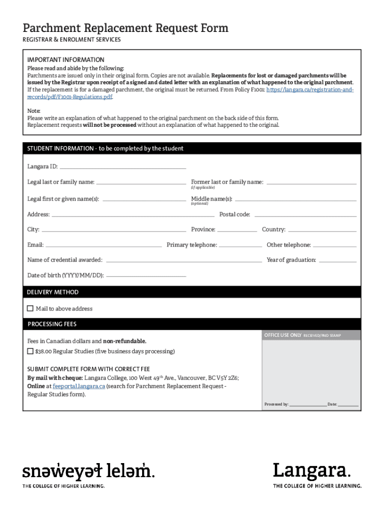 Parchment Replacement Request Form REGISTRAR & Enrollment SERVICESIMPORTANT INFORMATION Please read and abide by the following: Parchments are issued only in their original form. Copies are not available.