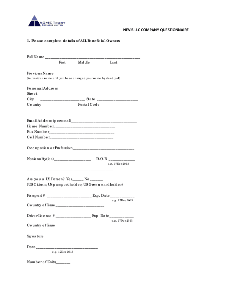 Fill out your nevis llc company questionnaire online with pdfFiller!