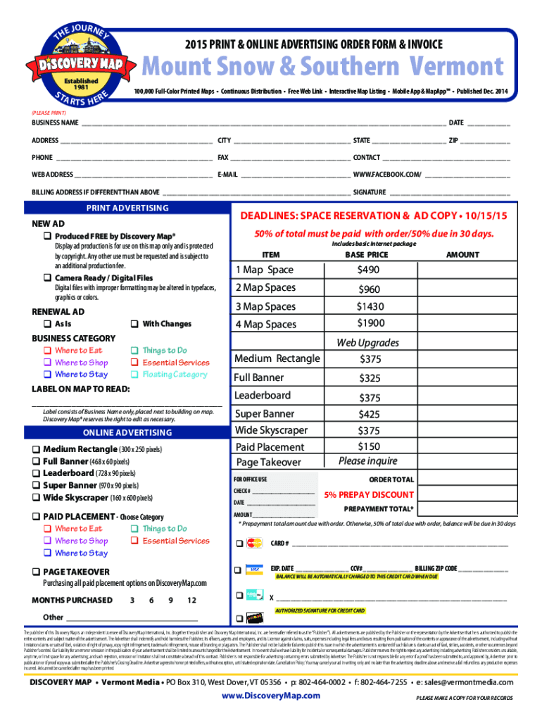 E JOURNEY Disestablished 1981A R TS H E RE2015 PRINT & ONLINE ADVERTISING ORDER FORM & INVOICE Mount Snow & Southern Vermont 100,000 Fullwood Printed Maps Continuous Distribution Free Web Link Interactive