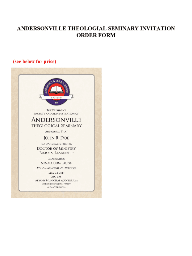ANDERSONVILLE THEOLOGICAL SEMINARY INVITATION ORDER FORM(see below for price)ANDERSONVILLE THEOLOGICAL SEMINARY INVITATION ORDER FORM INVITATIONS ARE SOLD IN QUALITIES OF 25 EACH 25 Invitations $25.00