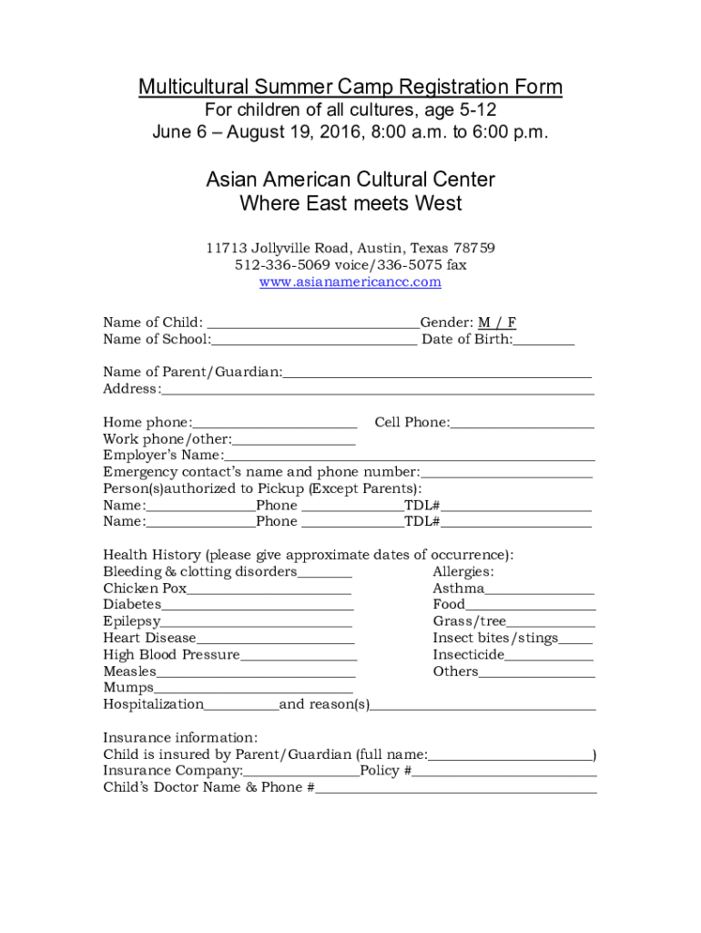 Multicultural Summer Camp Registration Form For children of all cultures, age 512 June 6 August 19, 2016, 8:00 a.m. to 6:00 p.m. Asian American Cultural Center Where East meets West 11713 Jollyville