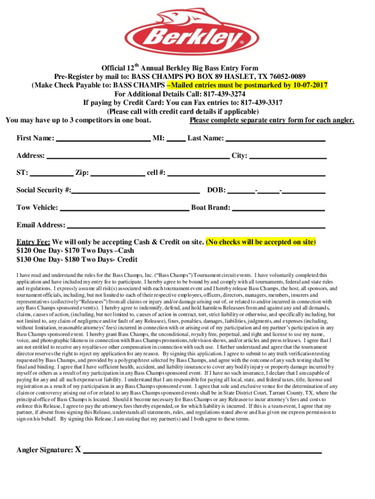 Of CIA En Ry Nonofficial 12th Annual Berkley Big Bass Entry Form