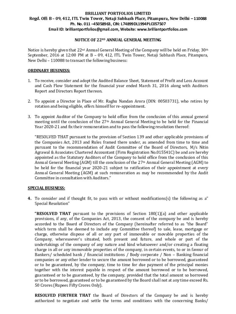 BRILLIANT PORTFOLIOS LIMITED Red. Off: B 09, 412, ITL Twin Tower, Nepali Subhash Place, Tempura, New Delhi 110088 pH. No. 011 45058963, IN: L74899DL1994PLC057507 Email ID: brilliant portfolios gmail.com,