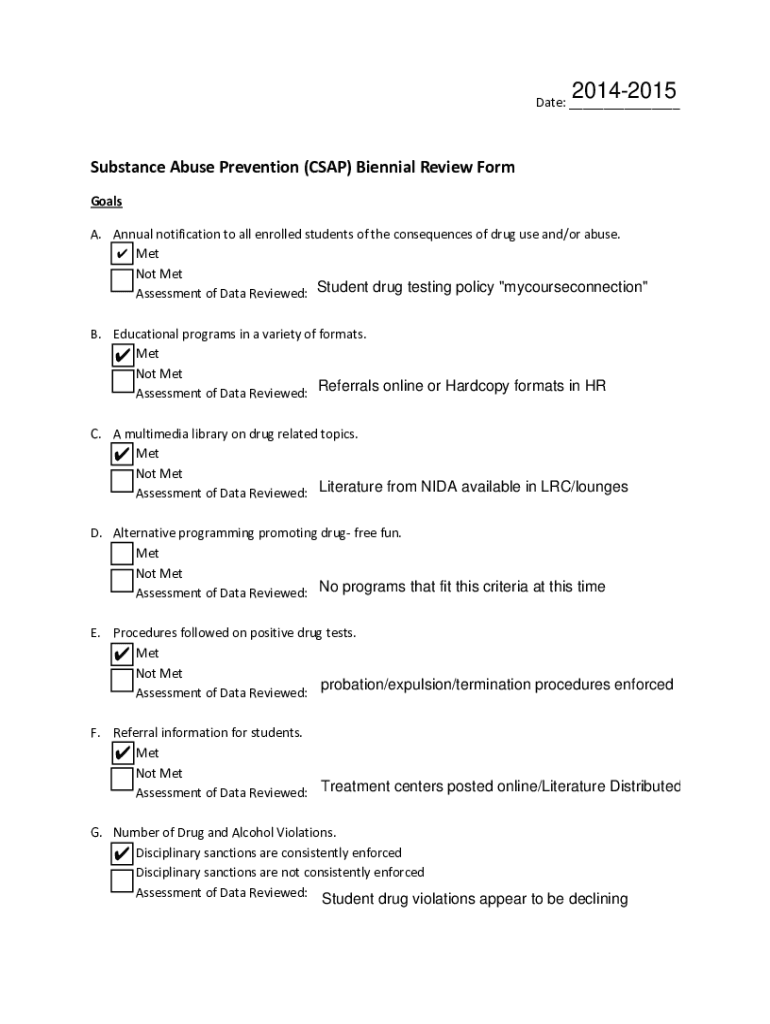 20142015Date: Substance Abuse Prevention (CAP) Biennial Review Form Goals A. Annual notification to all enrolled students of the consequences of drug use and/or abuse. Met Not Met Assessment of Data