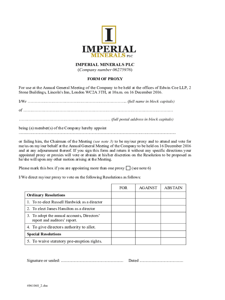 IMPERIAL MINERALS PLC (Company number 06275976) FORM OF PROXY For use at the Annual General Meeting of the Company to be held at the offices of Edwin COE LLP, 2 Stone Buildings, Lincoln's Inn, London
