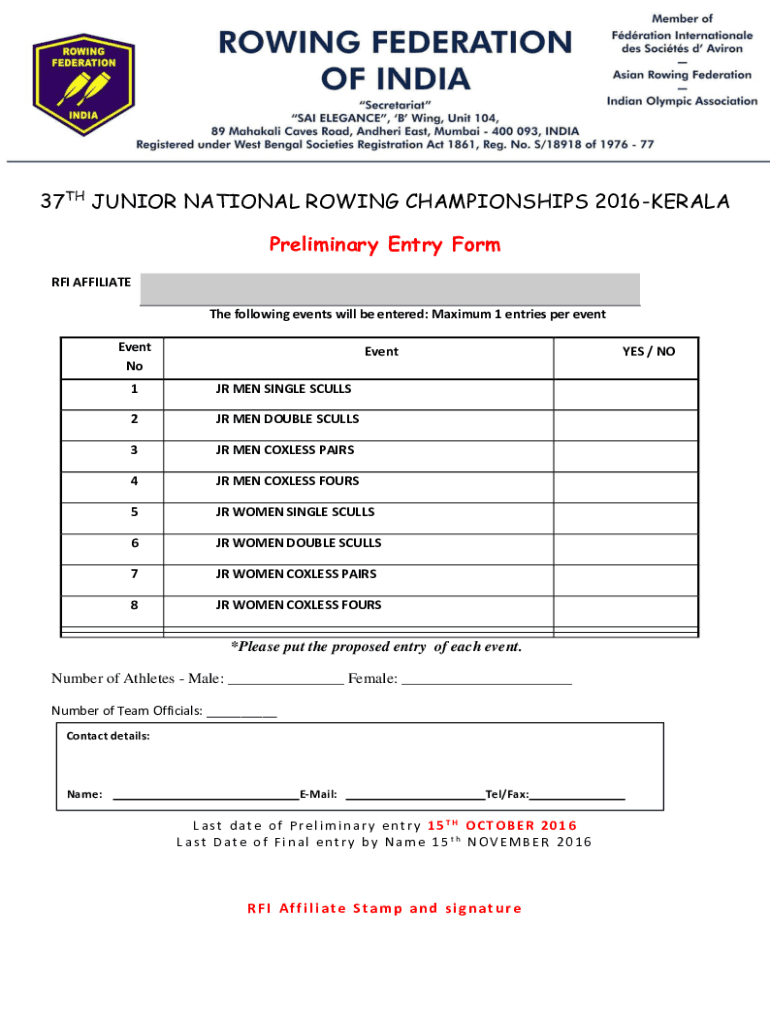37TH JUNIOR NATIONAL ROWING CHAMPIONSHIPS 2016KERALA Preliminary Entry Form RFI AFFILIATE The following events will be entered: Maximum 1 entries per event NoEvent1JR MEN SINGLE SCULLS2JR MEN DOUBLE