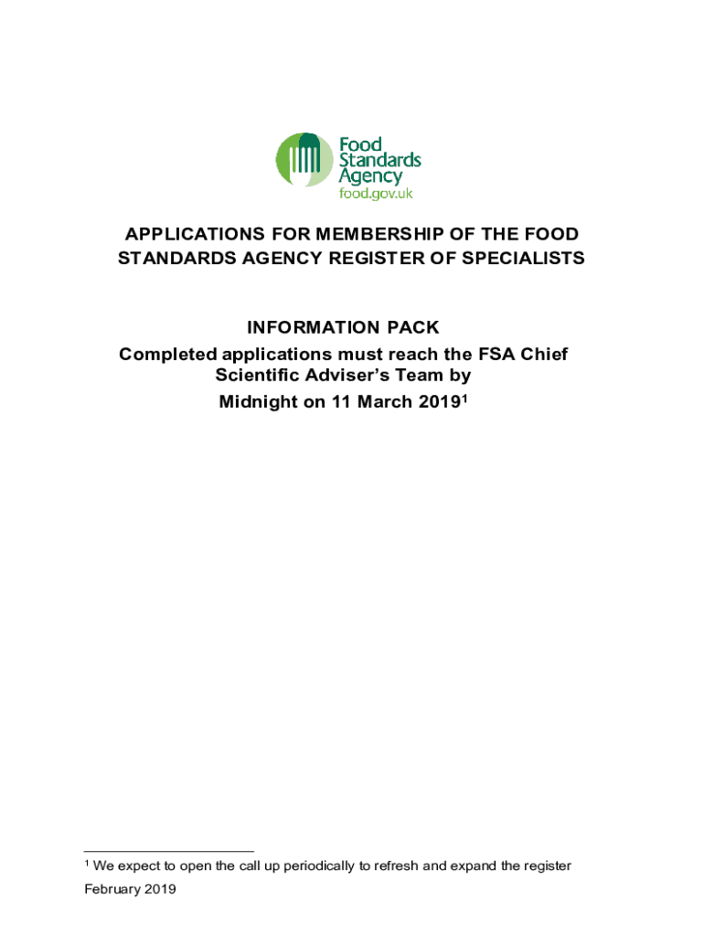 APPLICATIONS FOR MEMBERSHIP OF THE FOOD STANDARDS AGENCY REGISTER OF SPECIALISTS INFORMATION PACK Completed applications must reach the FSA Chief Scientific Advisers Team by Midnight on 11 March 2019