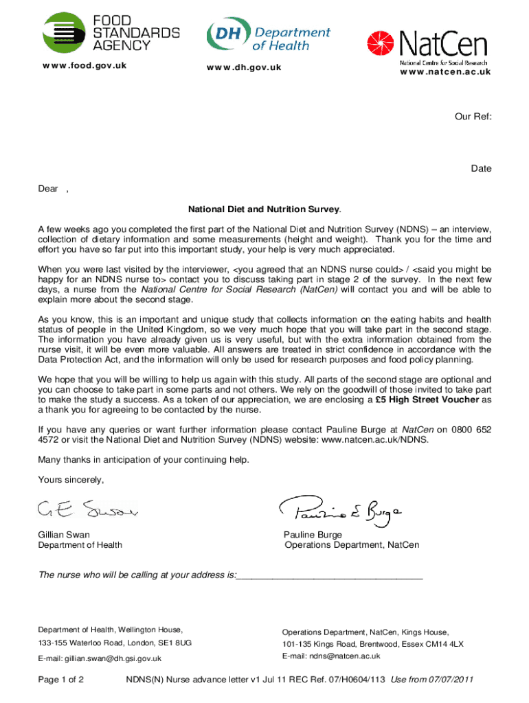 WWW.food.gov.squaw.DH.gov.squaw.nation.ac.four Ref:Date Dear, National Diet and Nutrition Survey. A few weeks ago you completed the first part of the National Diet and Nutrition Survey (NUNS) an interview,