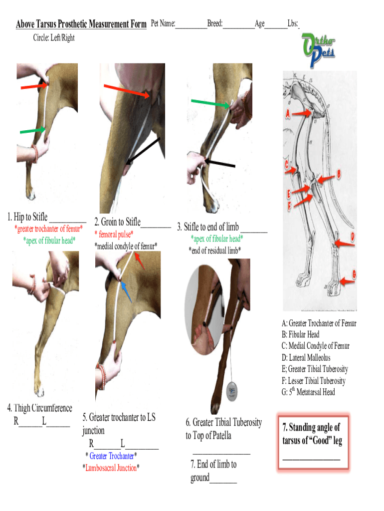 Above Tarsus Prosthetic Measurement Form Pet Name: Breed: Age Lbs: Circle: Left/Right1. Hip to Stifle *greater trochanter of femur* *apex of fibular head×2. Groin to Stifle 3. Stifle to end of limb