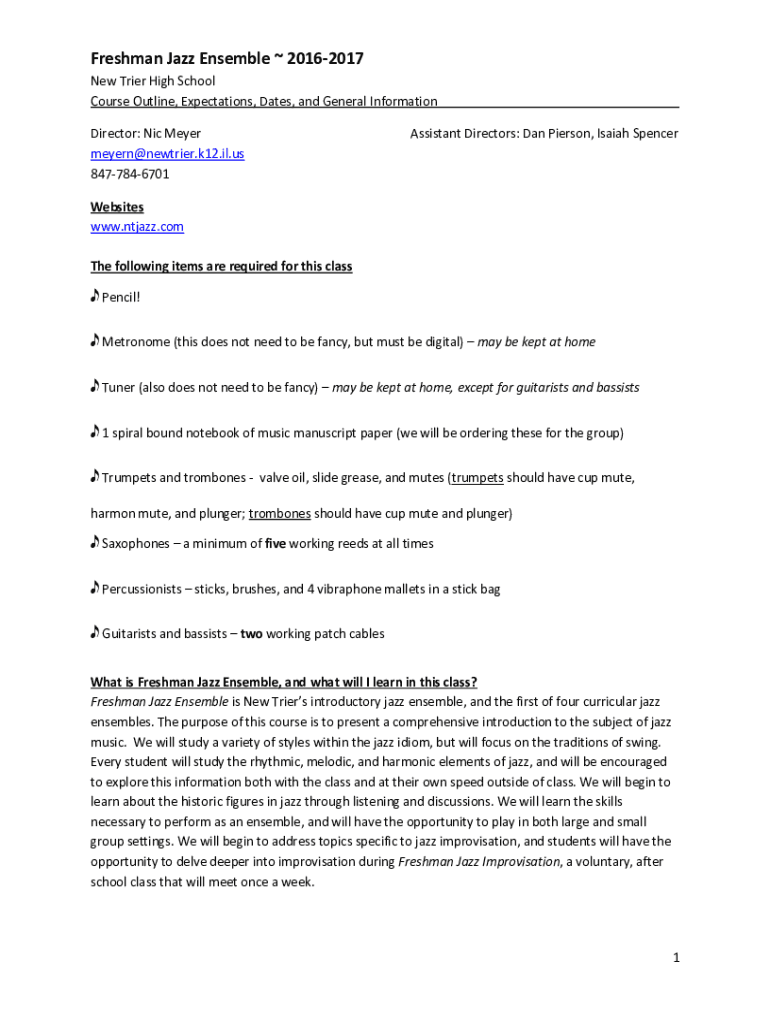 Freshman Jazz Ensemble 20162017 New Trier High School Course Outline, Expectations, Dates, and General Information Director: NIC Meyer earn new trier.k12.IL.us 8477846701Assistant Directors: Dan Pierson,