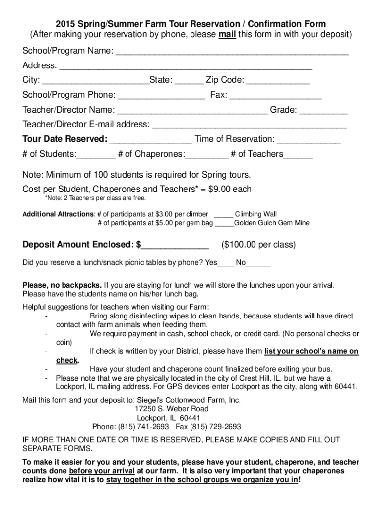 2015 Spring/Summer Farm Tour Reservation / Confirmation Form (After making your reservation by phone, please mail this form in with your deposit) School/Program Name: Address: City: State: Zip Code: