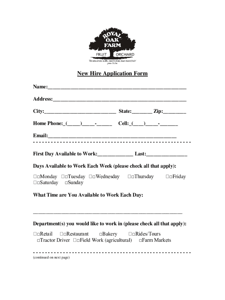 New Hire Application Form Name: Address: City: State: Zip: Home Phone: () Cell: () Email: First Day Available to Work: Last: Days Available to Work Each Week (please check all that apply): Monday