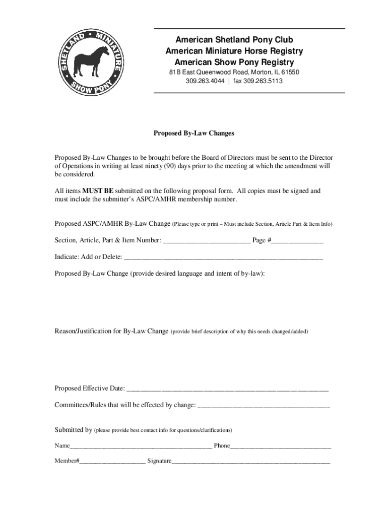 American Shetland Pony Club American Miniature Horse Registry American Show Pony Registry 81B East Queen wood Road, Morton, IL 61550 309.263.4044 fax 309.263.5113Proposed Bylaw ChangesProposed Bylaw