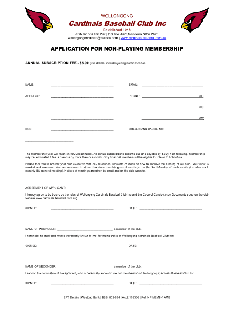 WOLLONGONGCardinals Baseball Club Inc Established 1948ABN 37 504 066 247 PO Box 447 Canberra NSW 2526 wollongongcardinals outlook.com www.cardinals.baseball.com.auAPPLICATION FOR NONPAYING MEMBERSHIP