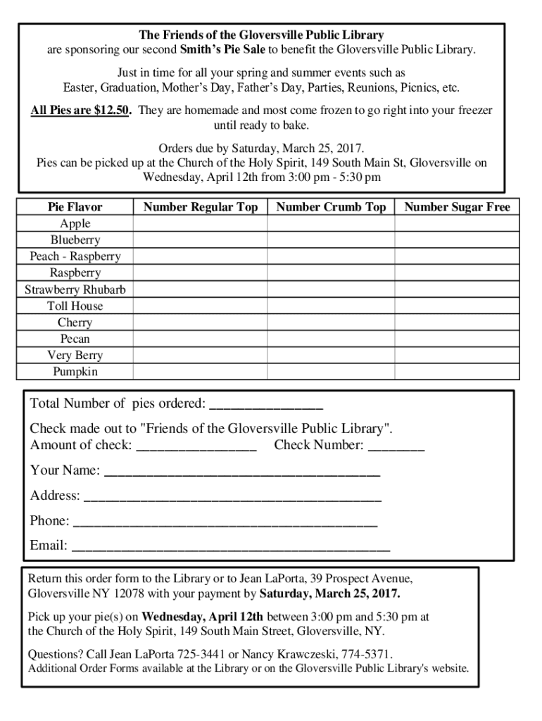 are sponsoring our second Smiths Pie Sale to benefit the Gloversville Public Library.