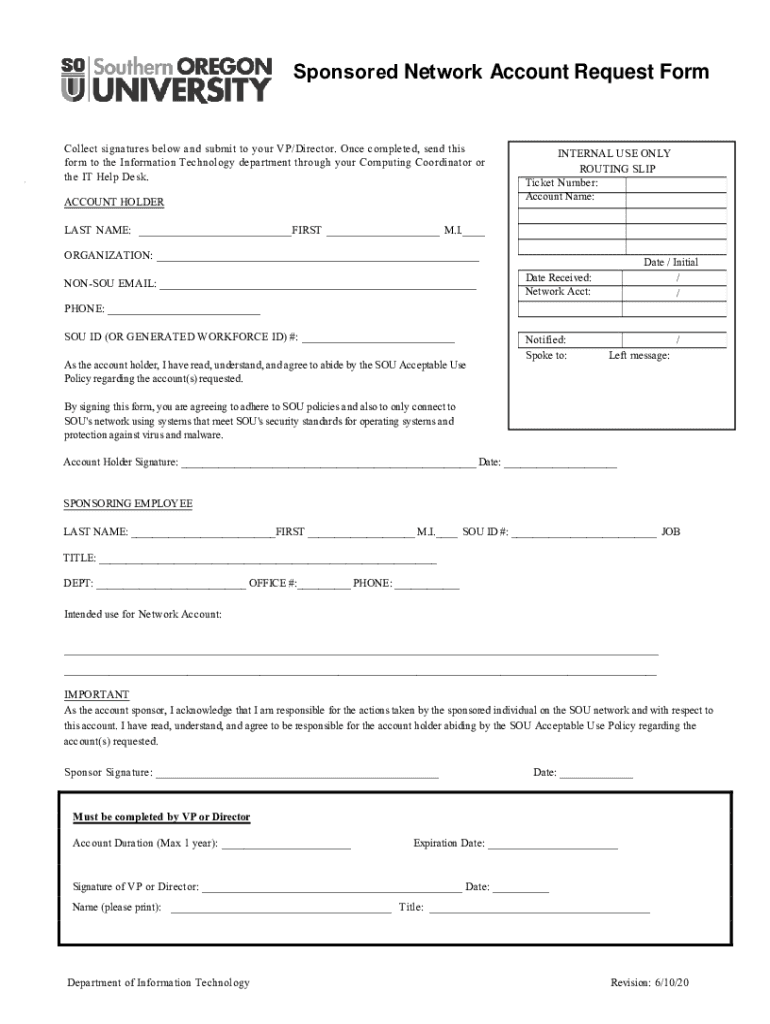 Sponsored Network Account Request Recollect signatures below and submit to your VP/Director. Once completed, send this form to the Information Technology department through your Computing Coordinator