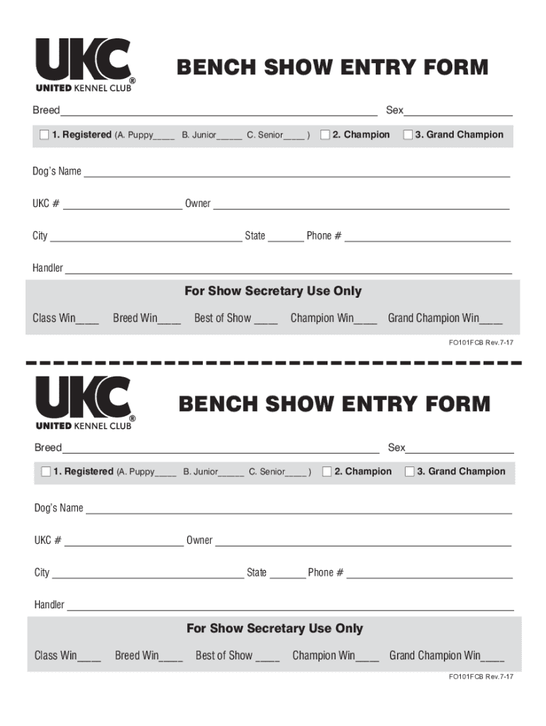 BENCH SHOW ENTRY FORM Breed Sex 1. Registered (A. Puppy B. Junior C. Senior)2. Champion3. Grand Champions Name UK # Owner City State Phone # Handler For Show Secretary Use Only Class Win Breed Win