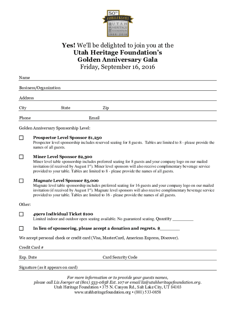 Yes! Well be delighted to join you at the Utah Heritage Foundations Golden Anniversary Gala Friday, September 16, 2016, Name Business/Organization Address CityStatePhoneZip Email Golden Anniversary
