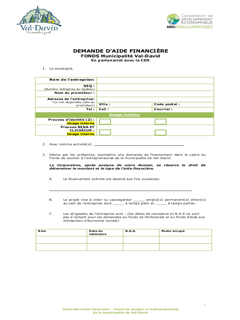 DEMANDED AIDE FINANCIAL FINDS Municipality Val David En partenariat Alec la CDE 1. Le's sous sign, Not de l 'enterprise: NEW : (Humor enterprise Du Quebec)Not Du promoter : Address DE lent reprise: