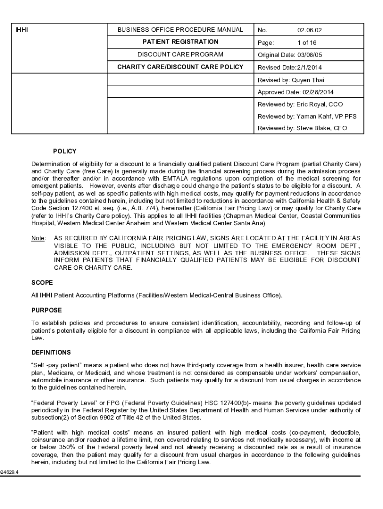 PATIENT REGISTRATION No.02.06.02Page:1 of 16DISCOUNT CARE PROGRAMOriginal Date: 03/08/05CHARITY CARE/DISCOUNT CARE POLICYRevised Date: 2/1/2014